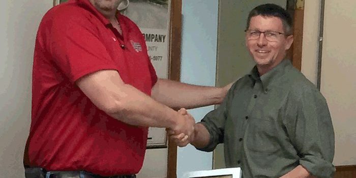 - Pat Pear, Left received plaque from Farmer City Mayor, Mike Jenkins for his years of service